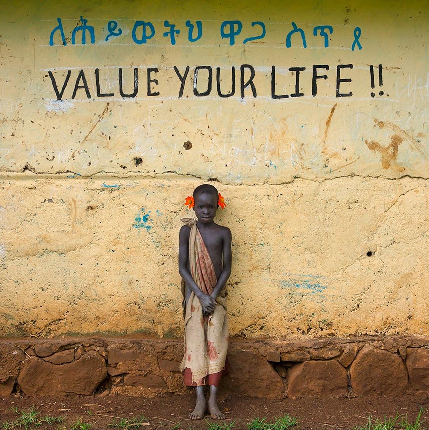 Suri Boy Leaning against a wall covered with Amharic and English Writing
